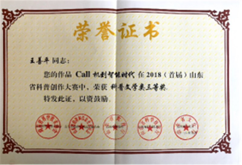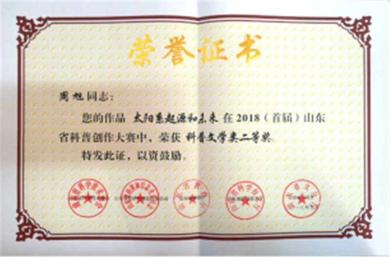 公司古天乐代言太阳集团组织报送的作品在此次大赛中获得了骄人的成绩,参赛作品获得科普文学类二等奖1项,三等奖2项,分别为周旭老师创作的作品《太阳系起源和未来》、王善平老师创作的作品《Call机到智能时代》、马燕老师创作的作品《不食烟火的“厨娘”》,同时获奖教师被邀请成为山东省科协科普创作会员。