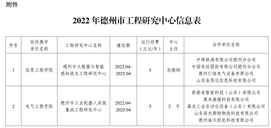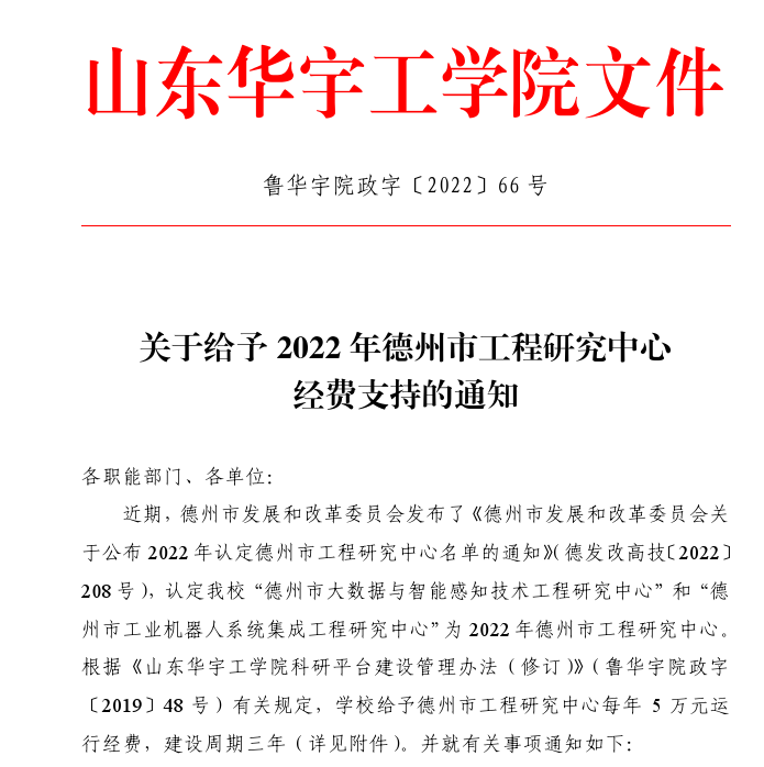 近日,公司发布了《关于给予2022年德州市工程研究中心经费支持的通知》鲁华宇院政字〔2022〕66号,通知中指出,给予德州市工程研究中心每年5万元运行经费,建设周期三年。