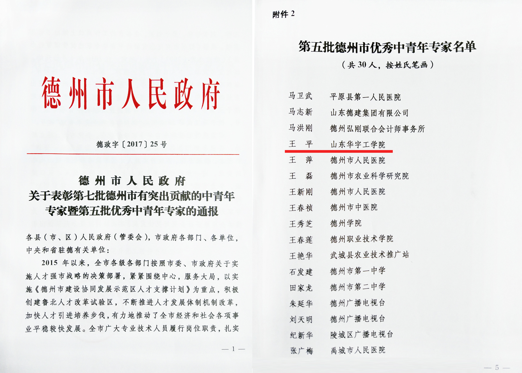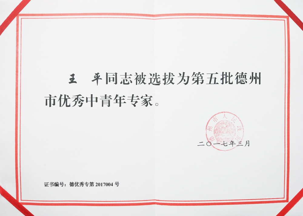 近日,在刚刚结束的德州市优秀中青年专家评选工作中,公司经理王平副教授荣获“第五批德州市优秀中青年专家”称号。