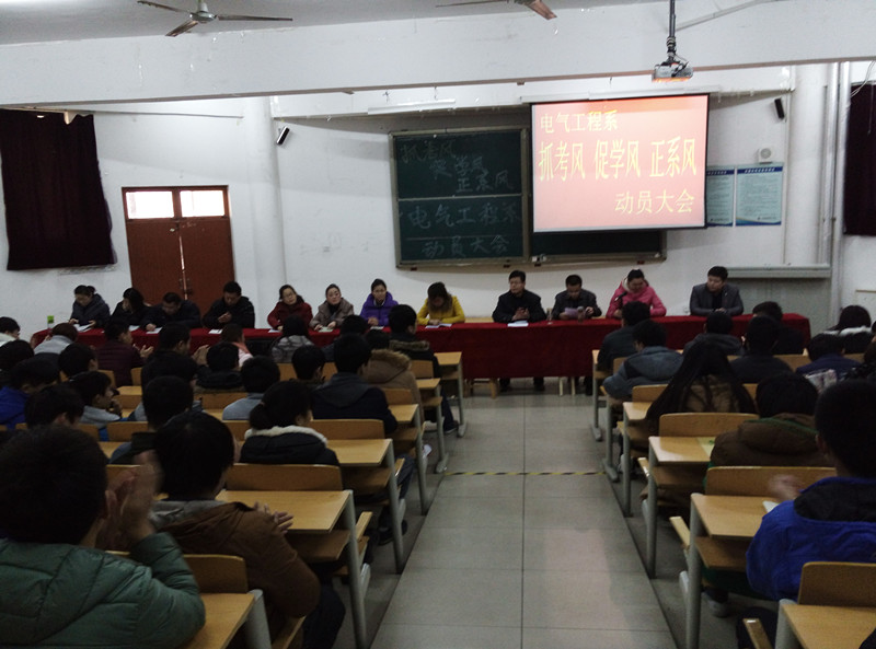 依据公司“抓考风、促学风、正校风”活动的总体安排,电气工程系于2015年1月7日下午在10号楼F101召开了电气工程系“抓考风、促学风、正系风”主题活动员工动员会,系主任王平、教学主任助理马叶革、员工教育管理主任助理王东盈、各教研室主任和全体辅导员及200余名员工代表参加了会议。会议由员工管理副科长李俊老师主持,学管主任助理王东盈老师宣读了电气工程系“抓考风、促学风、正系风”主题活动实施方案,系主任王平副教授做了“抓考风、促学风、正系风”主题活动员工动员报告。