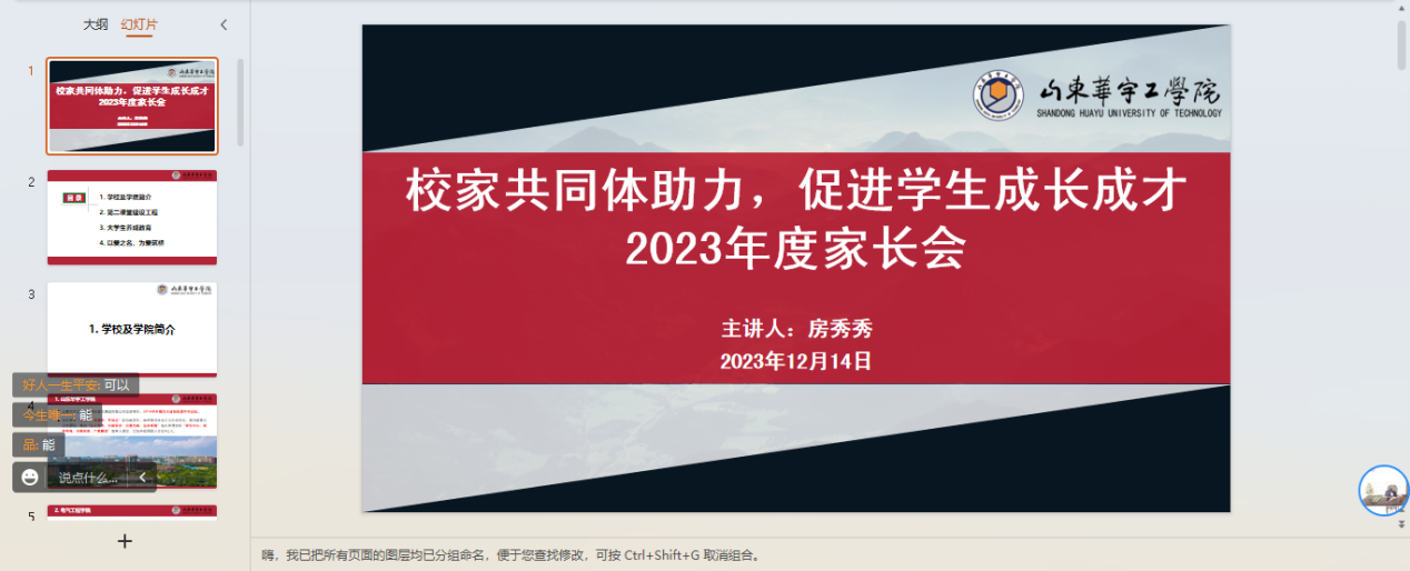 辅导员均通过家长会向家长们介绍了公司第二课堂建设工程主要内容,对本学期员工学习情况及课外活动参与情况进行了通报,同时对校家共同体育人情况进行了总结,鼓励家长们积极参与到校家共育的育人实践中来,帮助同学们实现德智体美劳的全面发展。