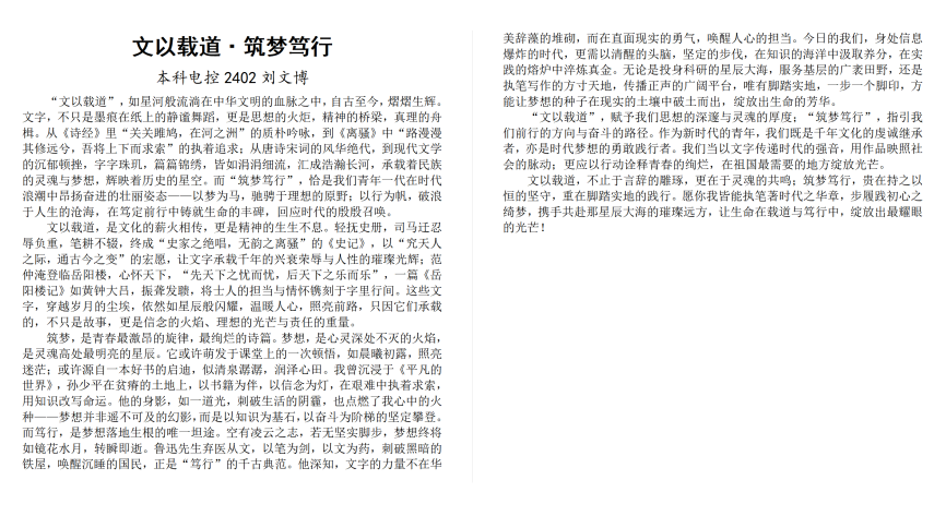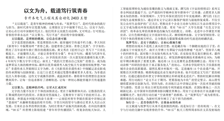 本次活动围绕“文以载道·筑梦笃行”主题,号召同学们创作体现理想追求、实干担当、成长感悟的原创文章,以文字抒发初心使命,彰显新时代青年以文聚力、笃行不怠的风采。活动期间,同学们踊跃参与,其中来自本科电控2402班的刘文博同学通过细腻的笔触和真挚的情感,诉说着笔墨传情、以行践梦的青春故事,专升本电气工程及其自动化2503班的王哲同学则在文章中描绘自己的成长轨迹、畅谈理想担当,展现出对人生价值的深刻思考与对时代使命的主动践行。