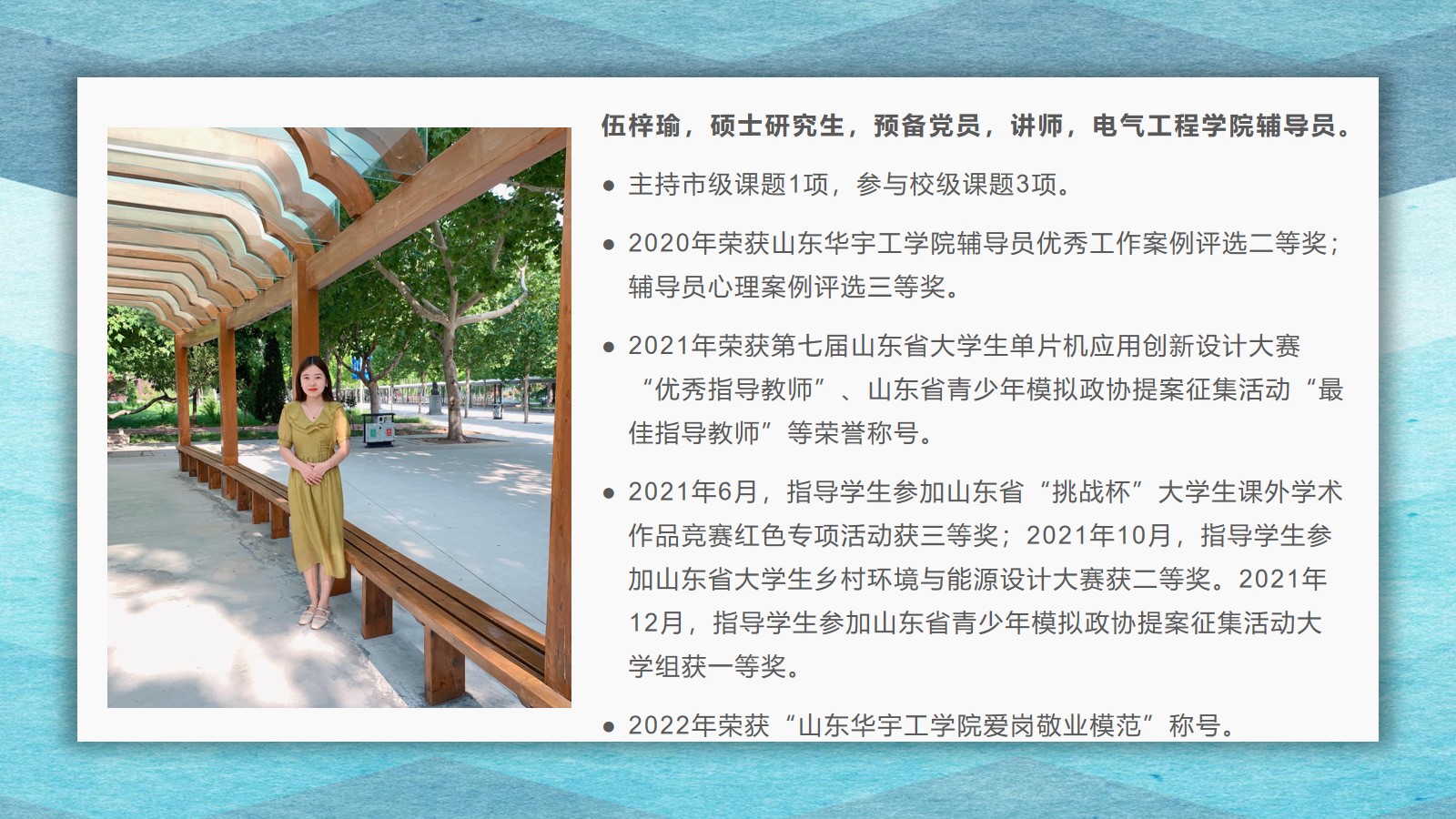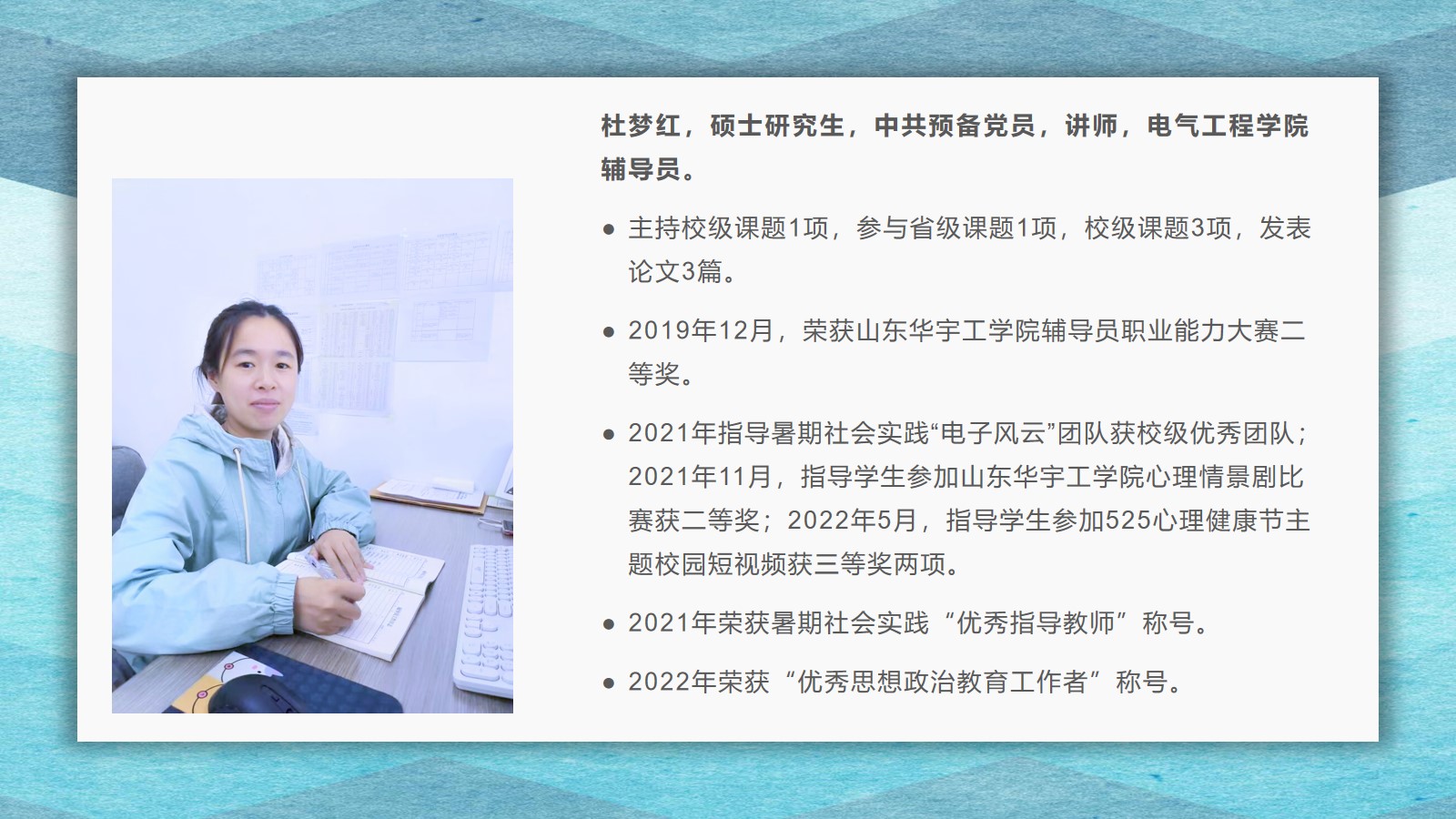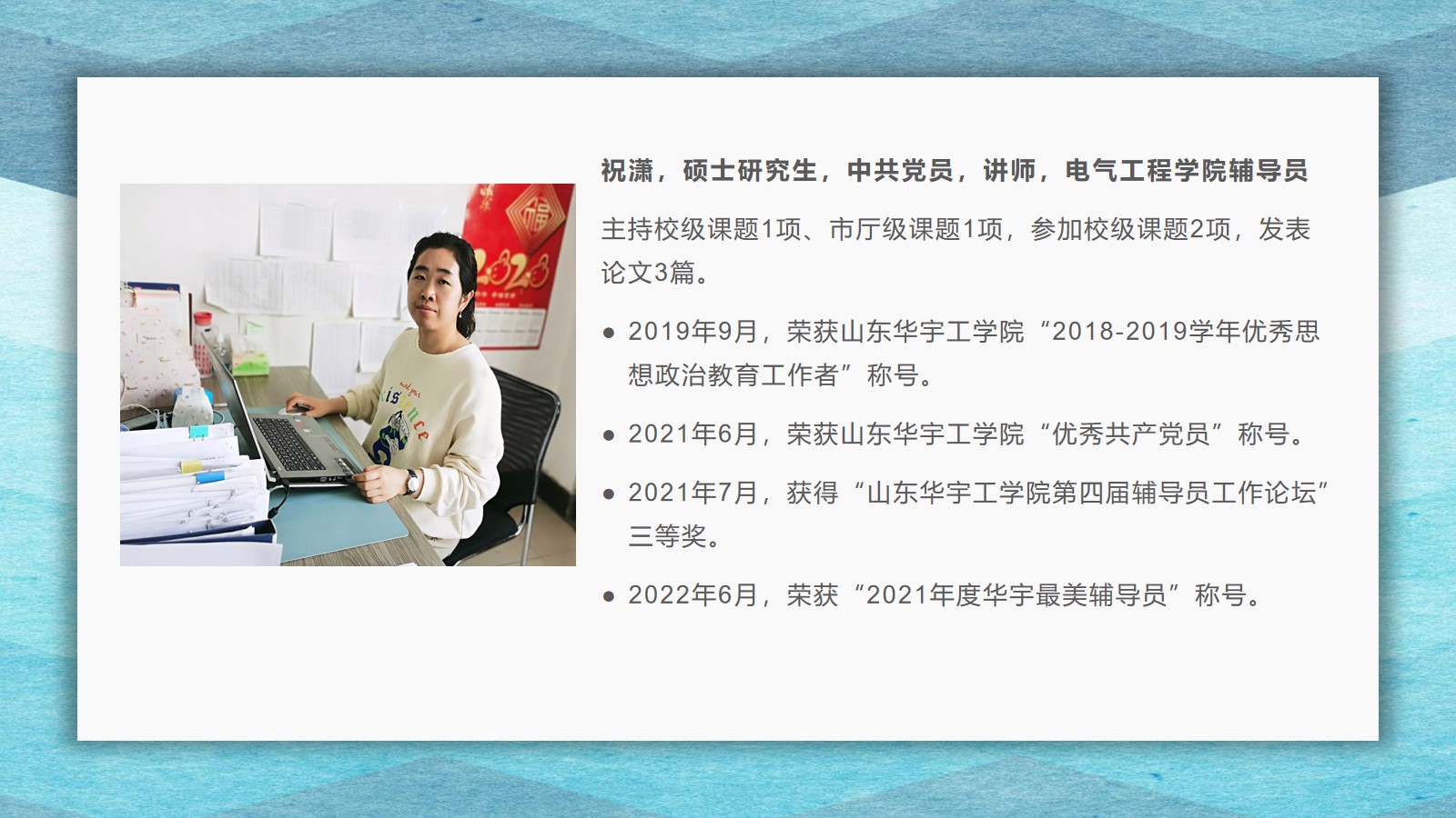 2021-2022学年,古天乐代言太阳集团坚持全面落实“立德树人”,在教学、科研、员工管理等方面,取得了较好的成绩,公司荣获古天乐代言太阳集团先进集体荣誉称号。为了弘扬尊师重教的良好风尚,公司通过校园网、微信公众号等宣传平台,宣传了2021 年度华宇最美教师(辅导员)、2021—2022 学年“课程思政”优秀教师、2021—2022 学年“四有”好老师、优秀青年教师、优秀思想政治教育工作者等先进个人的典型事迹,充分发挥榜样的引领作用,引导全院教师坚定理想信念、厚植爱国情怀、涵养高尚师德,激励教师踔厉奋发、笃行不怠,以更加坚定的信心和更加饱满的热情投入到教书育人的工作中。